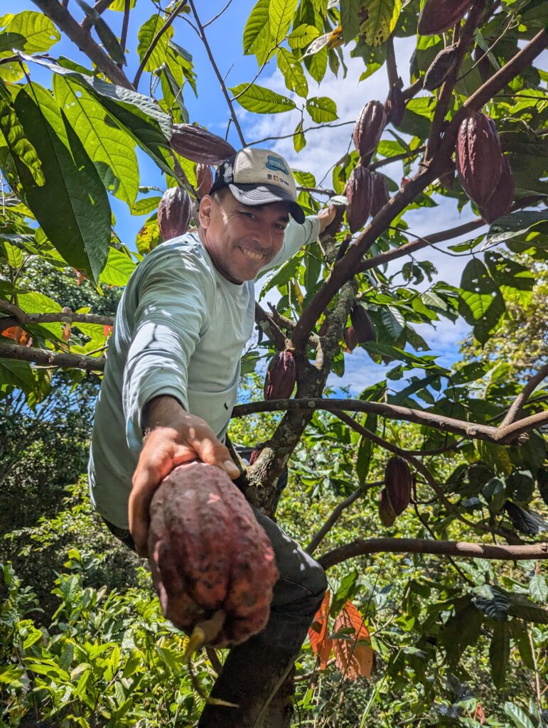 Un trabajador de Villa Ana baja entre los árboles de cacao con una sonrisa, invitando a capturar el momento que refleja la esencia del cultivo: trabajo, alegría y conexión con la tierra. 🌿📸